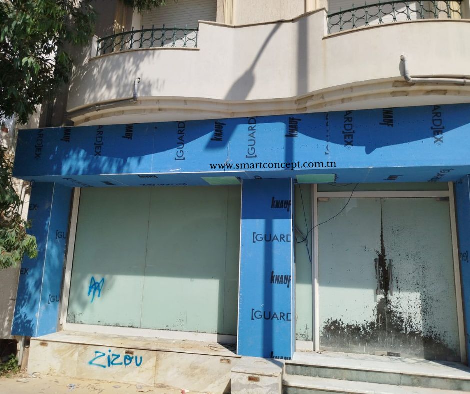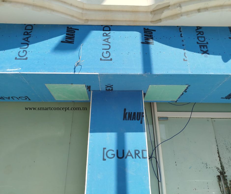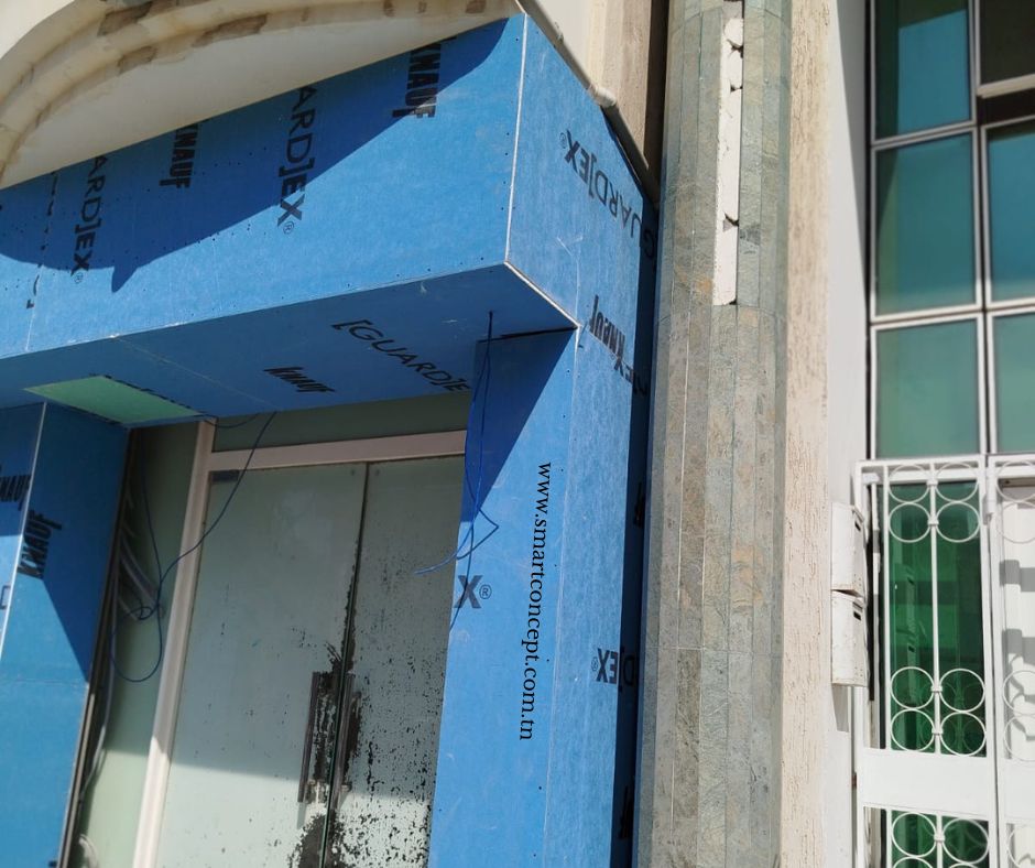 Dans le cadre de la rénovation de la façade d’une pharmacie, nos équipes ont assuré la fourniture et la pose de plaques de plâtre extérieur type GUARDEX, spécialement conçues pour les environnements exposés aux intempéries.
