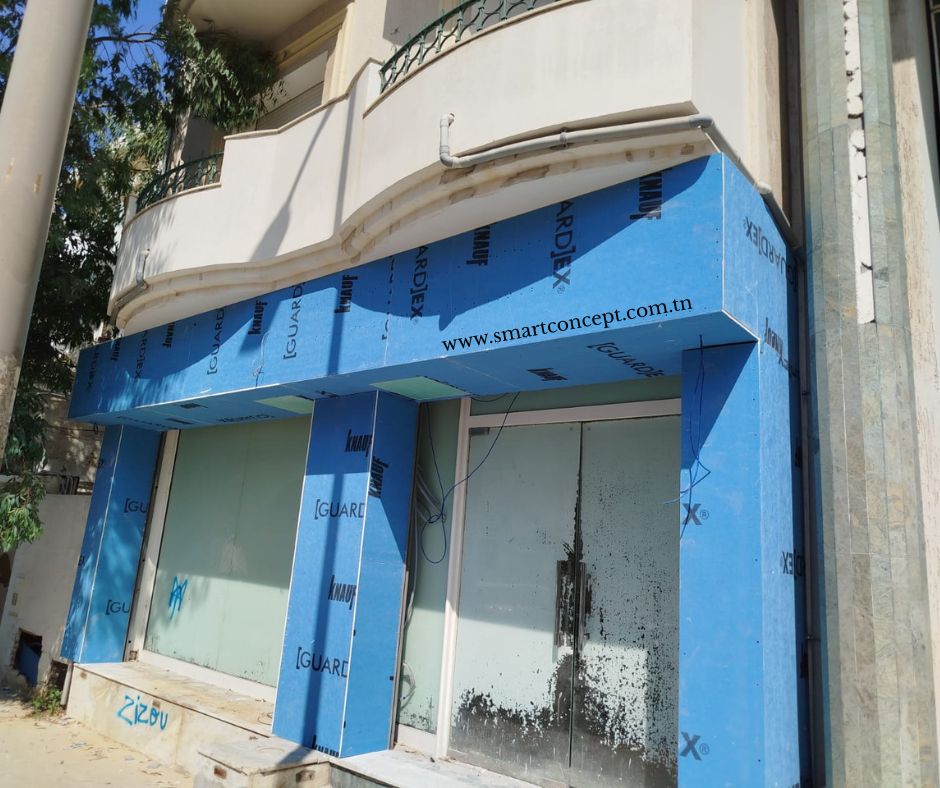 Fourniture et pose de placoplâtre extérieur en plaques GUARDEX – Façade de Pharmacie